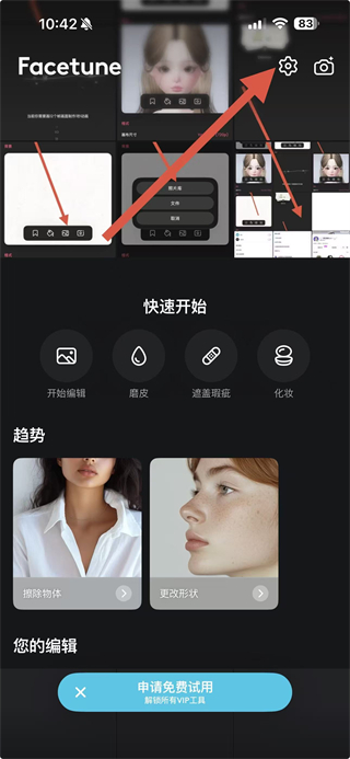1、打開Facetune應(yīng)用,在主界面點(diǎn)擊右上角的設(shè)置齒輪圖標(biāo),進(jìn)入設(shè)置頁面。