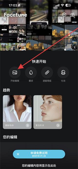 1、打開Facetune應(yīng)用,點(diǎn)擊開始編輯選項(xiàng)進(jìn)入圖片庫選擇界面。