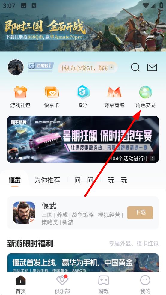 1、打開騰訊心悅俱樂部APP,在首頁點擊角色交易圖標,進入角色交易界面。