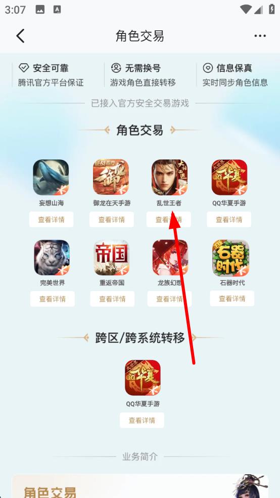 2、在角色交易界面中,瀏覽已接入官方安全交易的游戲,選擇想購買角色的游戲,點擊查看詳情。