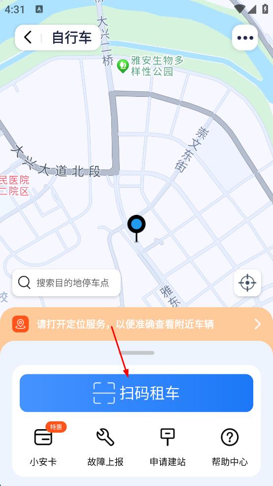 2、在自行車地圖界面,點(diǎn)擊“掃碼租車”按鈕,跳轉(zhuǎn)至掃碼頁(yè)面。
