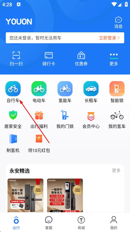 1、打開(kāi)永安行APP,在出行頁(yè)面點(diǎn)擊“自行車”選項(xiàng),進(jìn)入自行車租賃地圖界面。