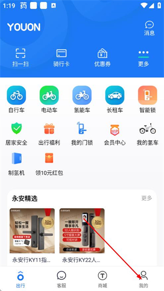 1、打開(kāi)永安行APP,點(diǎn)擊底部我的選項(xiàng),進(jìn)入個(gè)人頁(yè)面。