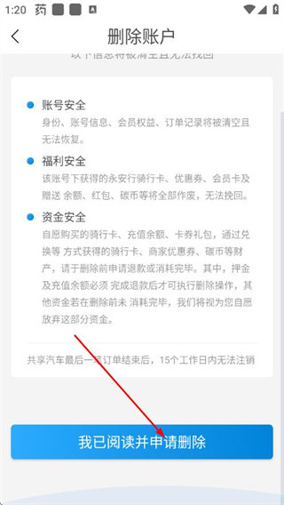 4、在刪除賬戶界面點(diǎn)擊我已閱讀并申請(qǐng)刪除,進(jìn)入驗(yàn)證環(huán)節(jié)。