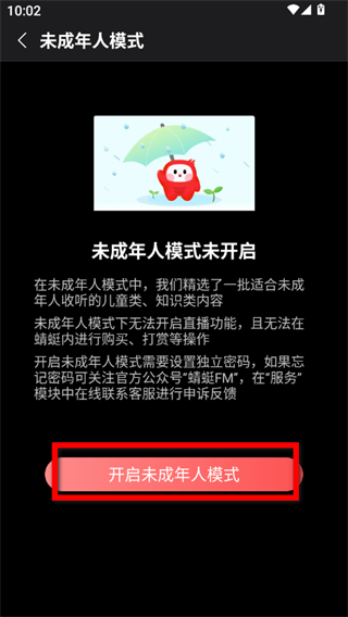 3、在未成年人模式界面,點擊開啟未成年人模式按鈕,進入密碼設置流程即可。