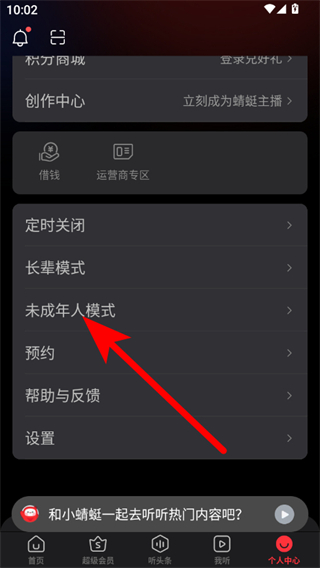 2、在個人中心界面,點擊未成年人模式選項,進入未成年人模式界面。