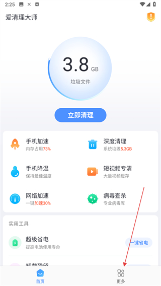 1、打開(kāi)愛(ài)清理大師APP,點(diǎn)擊右下角更多。