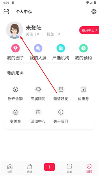 2、在個人中心頁面,點擊頭像位置處未登錄按鈕。