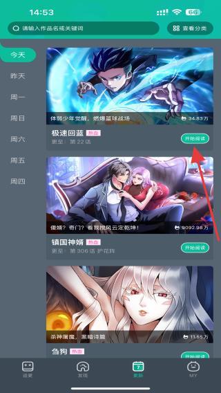 2、在更新列表中,找到想閱讀的漫畫,點(diǎn)擊漫畫封面或右側(cè)的開始閱讀按鈕。