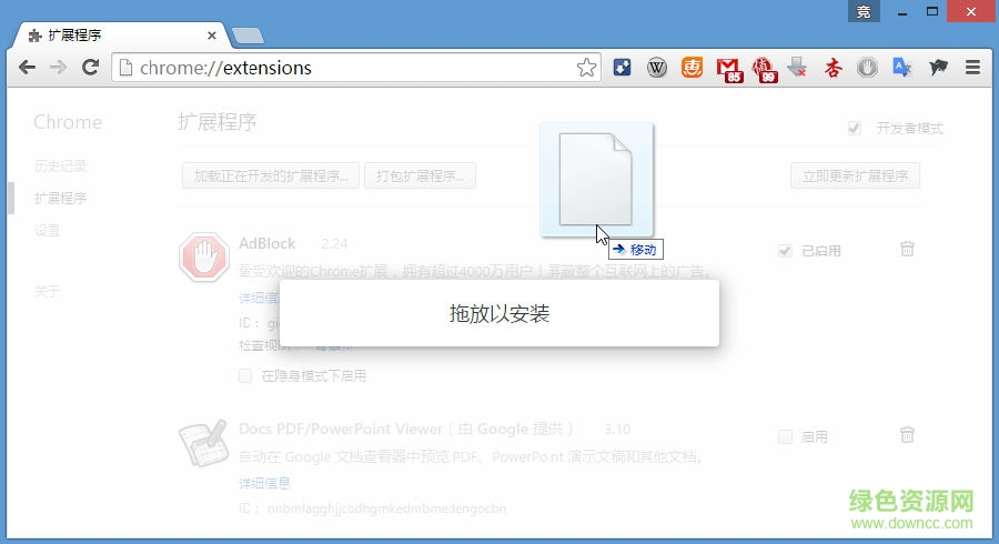 4.按住鼠標左鍵將文件拖拽至Chrome瀏覽器的主界面中,看到Chrome瀏覽器中出現(xiàn)“拖放以安裝”提示時,松開鼠標左鍵