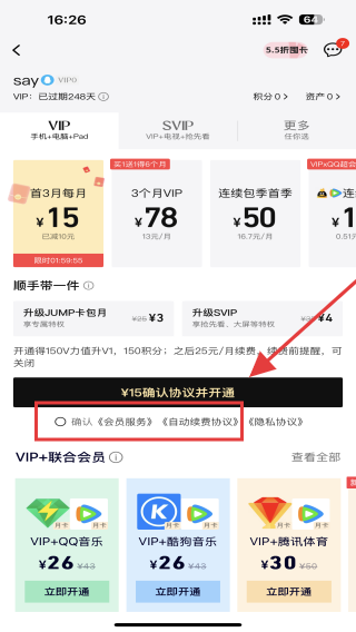 4、點擊后,會彈出相關(guān)的內(nèi)容,用戶可任需選擇并勾選會員服務(wù)、隱私協(xié)議,再點擊確認協(xié)議并開通即可。