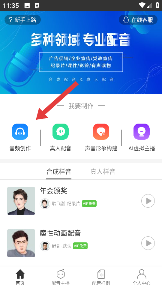 1、在訊飛配音主界面,需要點(diǎn)擊音頻創(chuàng)作,進(jìn)入合成配音的頁(yè)面。