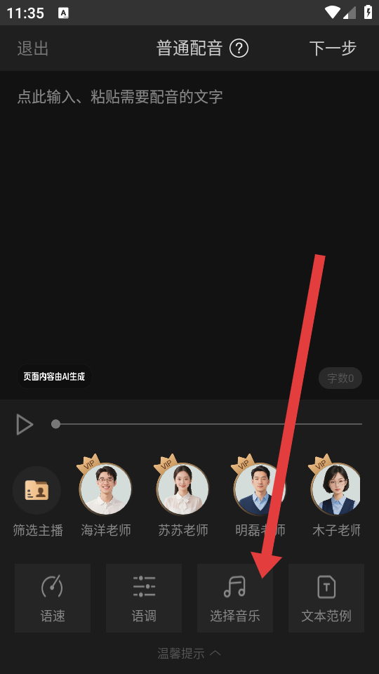 3、在普通配音界面,點(diǎn)擊下方的選擇音樂(lè)選項(xiàng),進(jìn)入音樂(lè)選擇頁(yè)面。