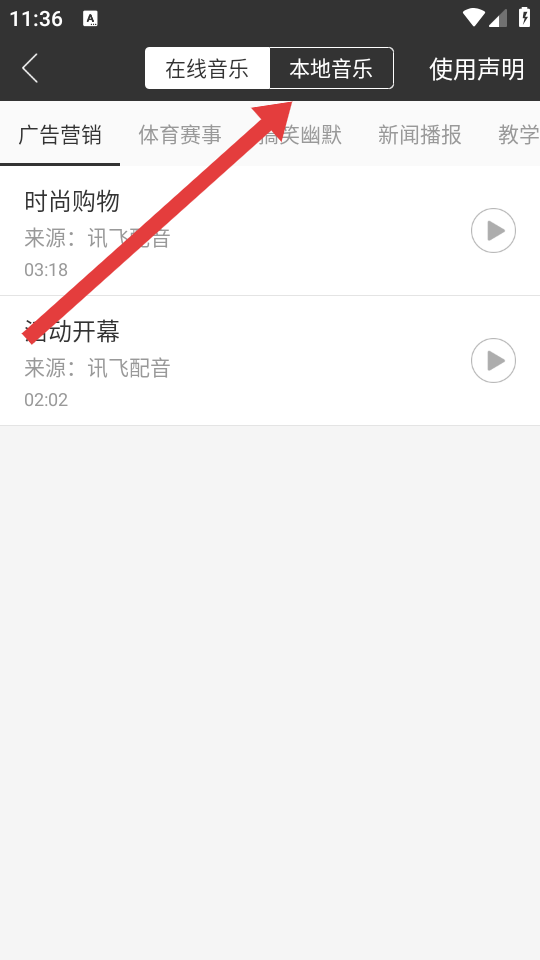 4、在音樂(lè)選擇頁(yè)面,點(diǎn)擊本地音樂(lè)的標(biāo)簽,即可切換到本地音樂(lè)列表進(jìn)行選擇。