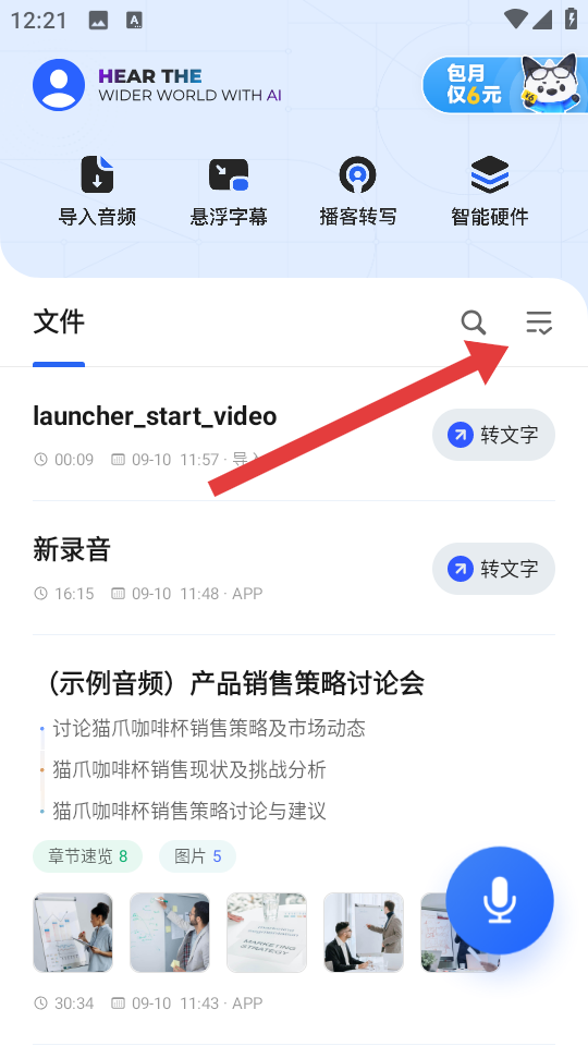 1、在訊飛聽見主界面,點擊文件區(qū)域右上角的批量處理圖標,進入文件批量處理頁面。
