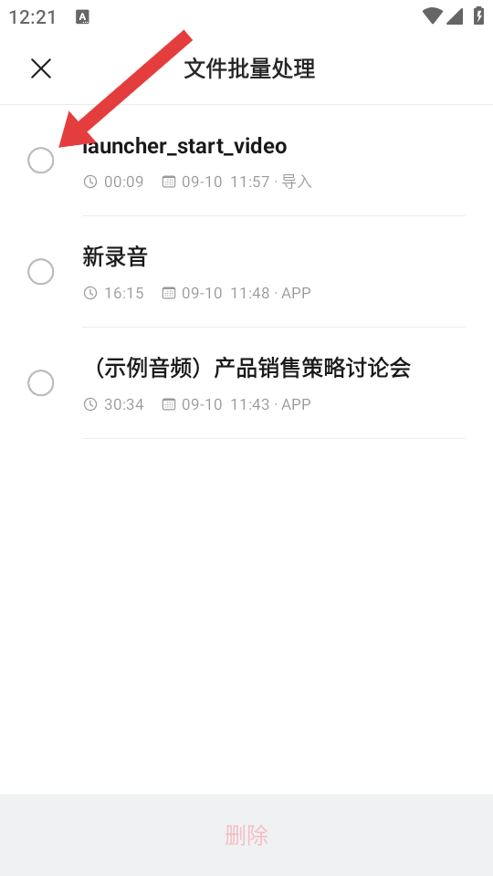 2、在文件批量處理頁面,點擊要刪除的錄音左側(cè)的圓形選擇框,勾選該錄音。