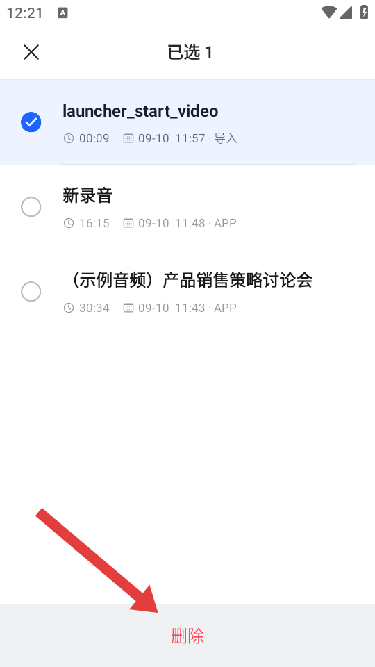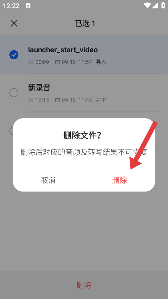 4、在刪除文件的確認彈窗中,點擊刪除,即可刪除選中的錄音。