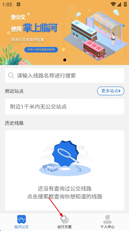 1、打開掌上臨河APP,進入首頁后,點擊頁面下方“出行方案”按鈕。