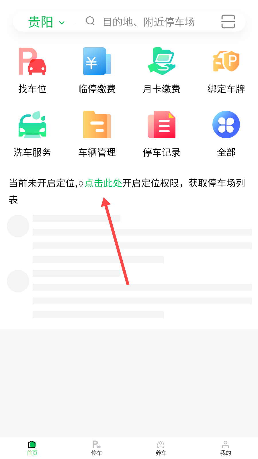 2、提示當(dāng)前未開啟定位,點擊此處開啟定位權(quán)限,獲取停車場列表,用于引導(dǎo)開啟定位獲取附近車場信息。