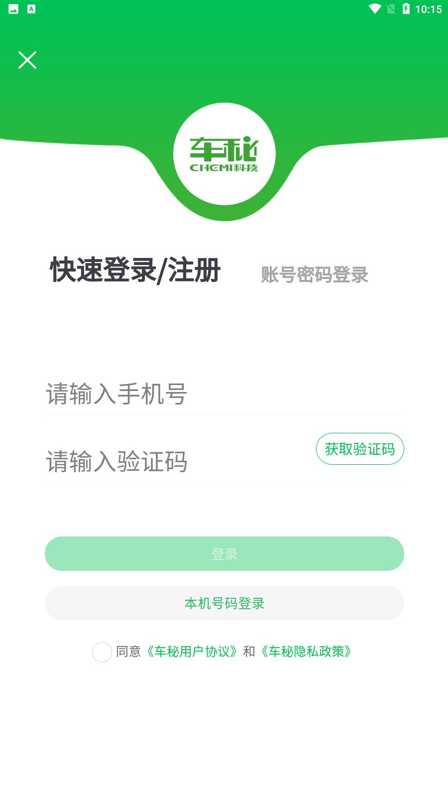 1、快速登錄注冊、手機號獲取驗證碼本機號碼登錄,以及需勾選同意的車秘用戶協(xié)議和車秘隱私政策。