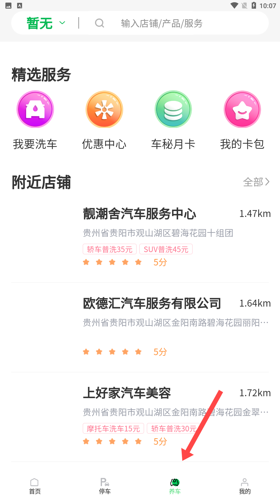 3、底部有停車,養(yǎng)車等精選服務(wù),還有附近汽車服務(wù)店鋪信息,可搜索目的地或附近停車場,有找車位、臨停繳費等功能入口便捷查詢停車點位。