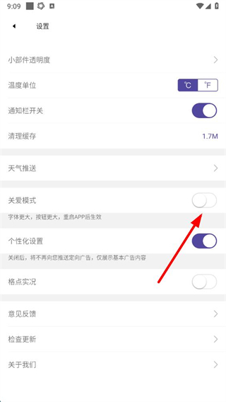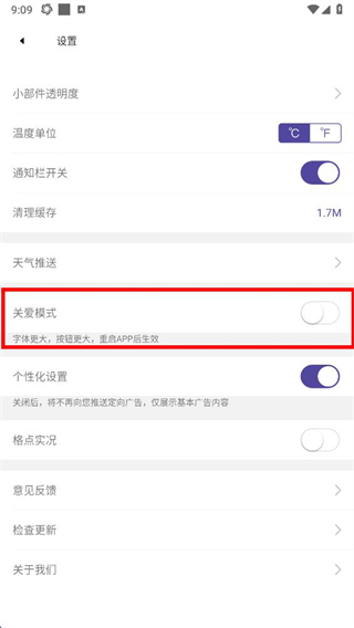 4、點擊其右側的開關按鈕,將其開啟,重啟app后,關愛模式即可生效。