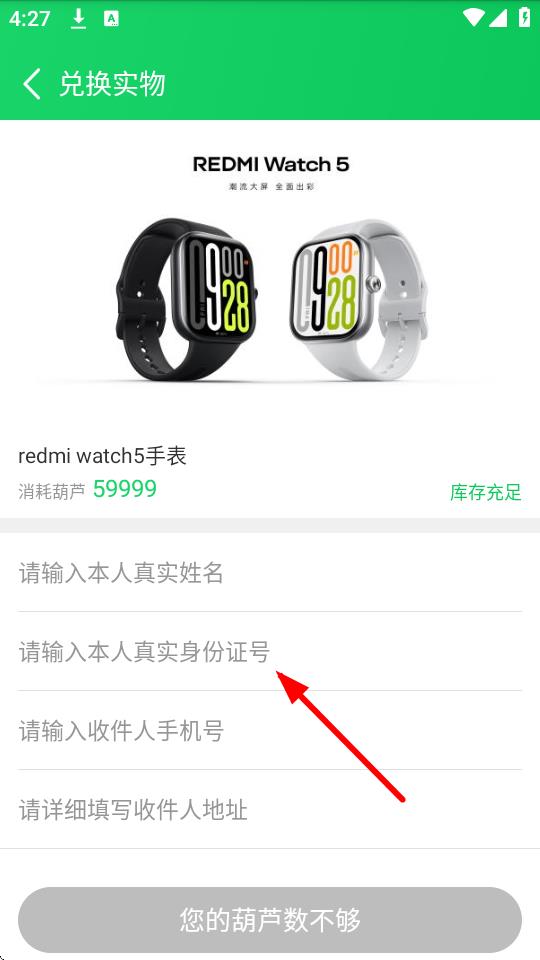4、若要兌換實(shí)物商品,進(jìn)入對應(yīng)商品兌換頁,如實(shí)填寫姓名、身份證號、手機(jī)號和收件地址等信息進(jìn)行兌換。