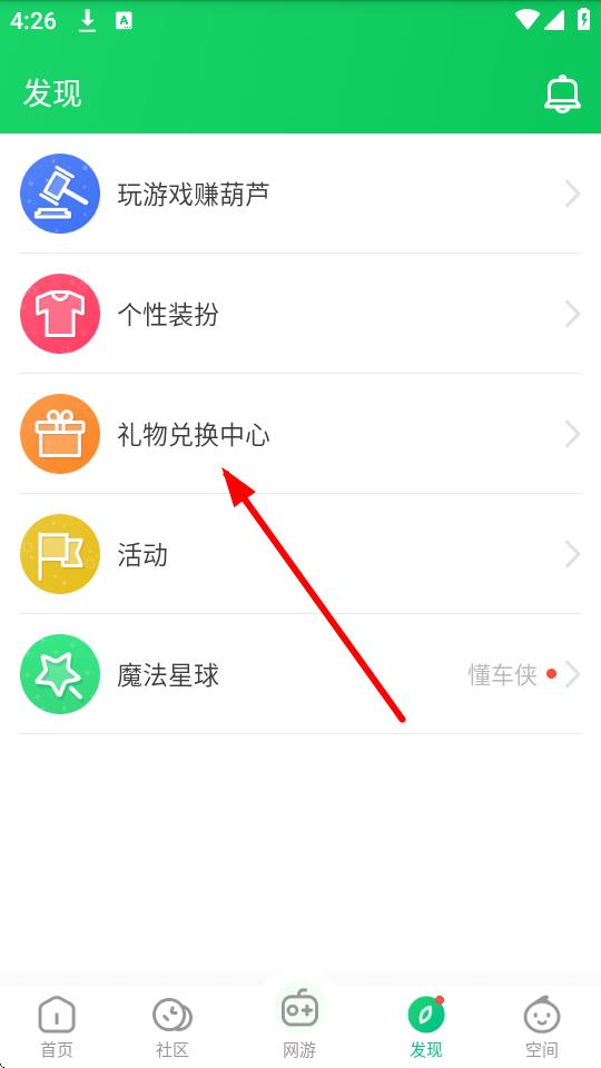 2、在發(fā)現(xiàn)頁面里,找到并點(diǎn)擊禮物兌換中心選項(xiàng),進(jìn)入兌換界面。