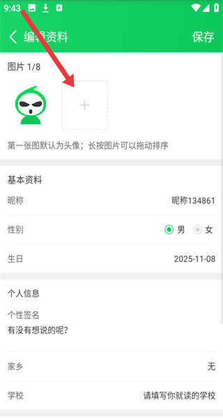 4、在編輯資料頁面點(diǎn)擊頭像區(qū)域的“+”號,選擇新頭像圖片后點(diǎn)擊“保存”,完成頭像修改操作。