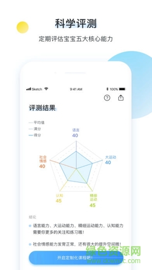 【定期評測】按寶寶的發(fā)育階段,周期性針對語言、大運動、精細動作、認知和社會情感五大項核心能力進行評測,每個能力項6道題,共30道題。每次評測結(jié)果均以雷達圖形式展示,并提供一份分析報告,便于直觀看到寶寶的各項發(fā)育情況,以及與同齡寶寶平均水平的對比,并針對性的給寶寶推薦相應(yīng)課程。