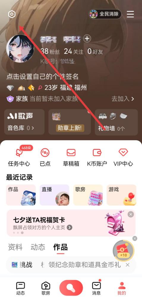 1、進(jìn)入全民K歌我的頁面,點(diǎn)擊左上角的設(shè)置圖標(biāo),進(jìn)入到設(shè)置的界面。