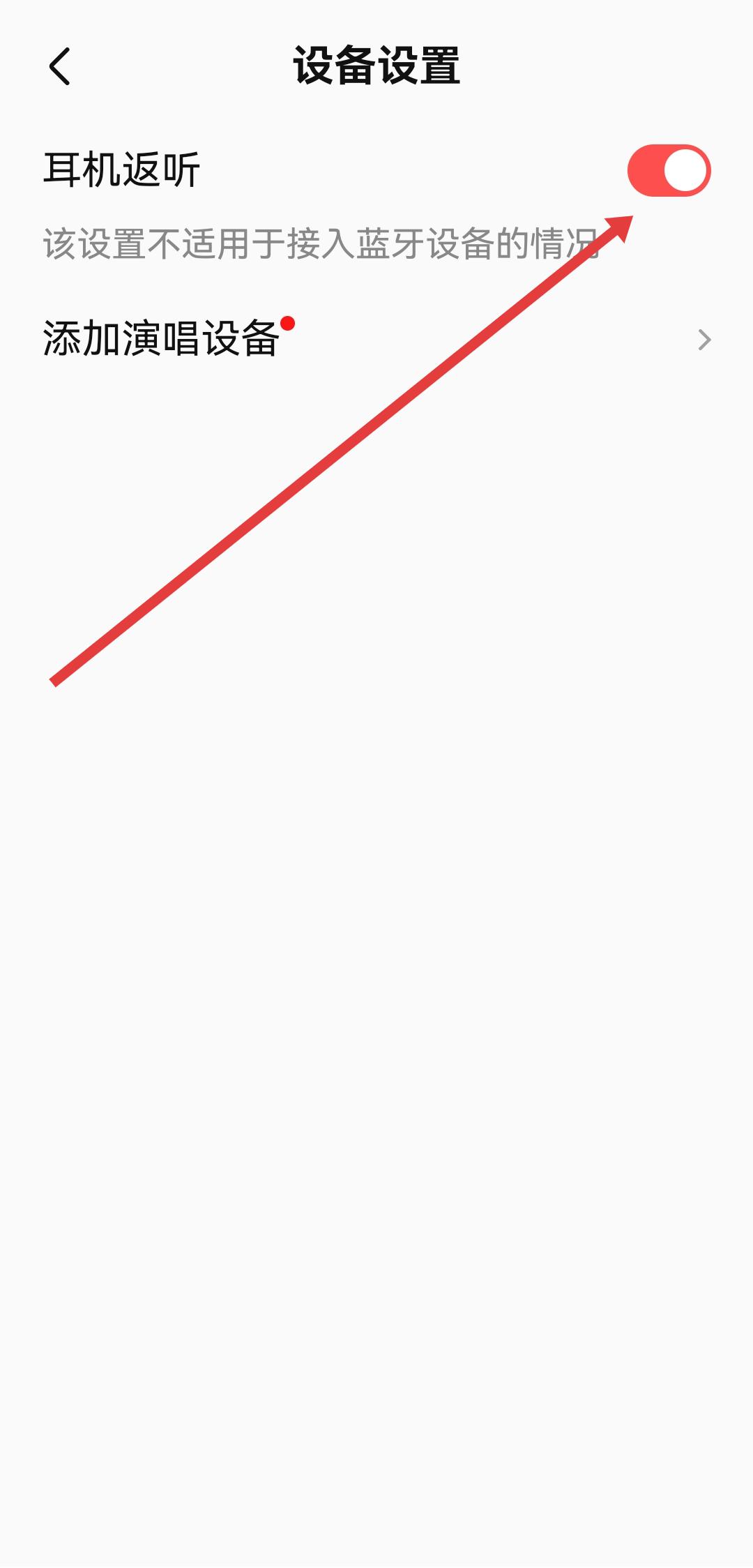 3、在設(shè)備設(shè)置頁面里,點(diǎn)擊耳機(jī)返聽右側(cè)的紅色開關(guān)按鈕,將其關(guān)閉,即可關(guān)閉耳返功能。