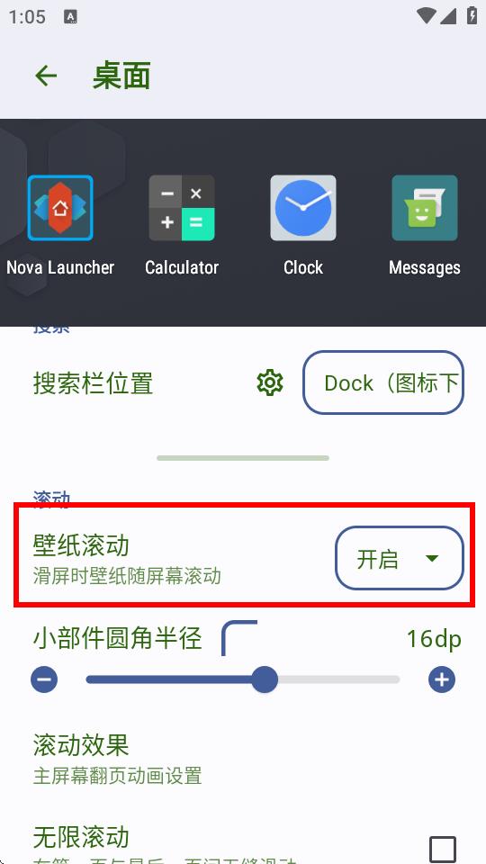 3、在桌面設(shè)置里找到壁紙滾動選項,點擊其右側(cè)按鈕選擇開啟,即可在滑屏時讓壁紙隨屏幕滾動。