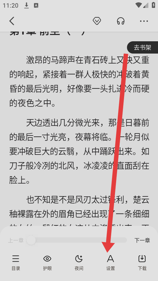 1、進入百度閱讀的書籍閱讀頁,我們需要點擊屏幕中間喚出工具欄,選擇設(shè)置開啟設(shè)置入口。