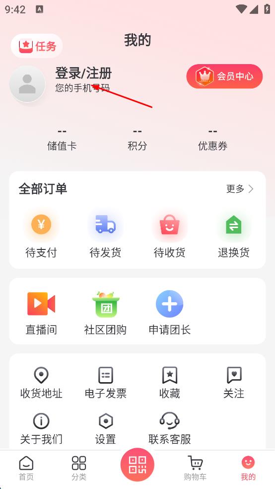 3、在個人中心頁面,找到“登錄/注冊”字樣,點擊它,進入登錄頁面。