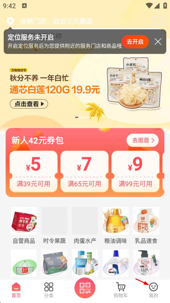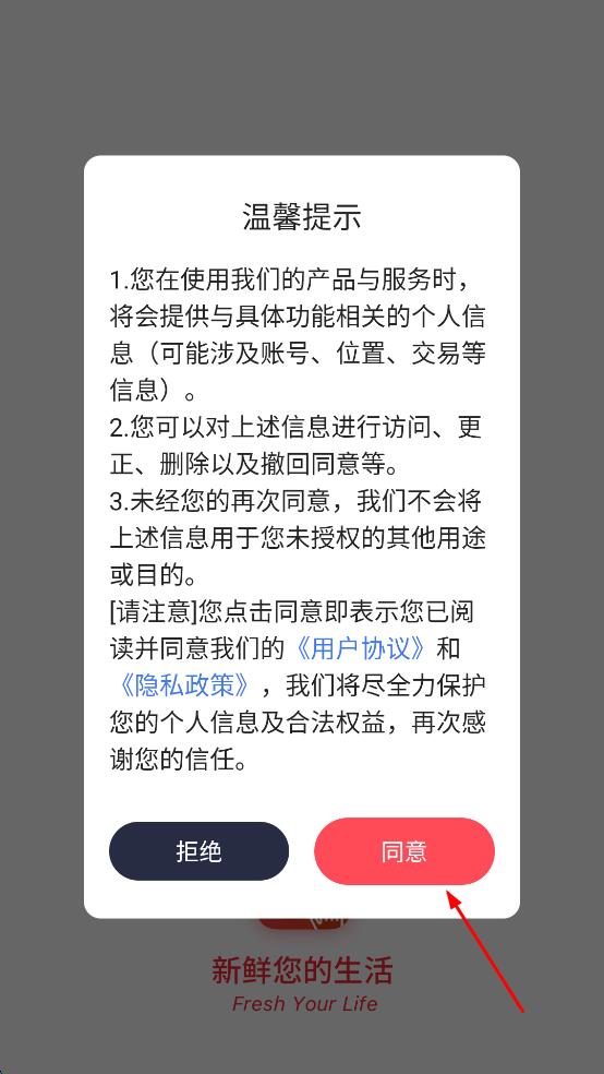 1、打開蓮花購APP,會彈出溫馨提示框,點擊同意,進入APP主界面。
