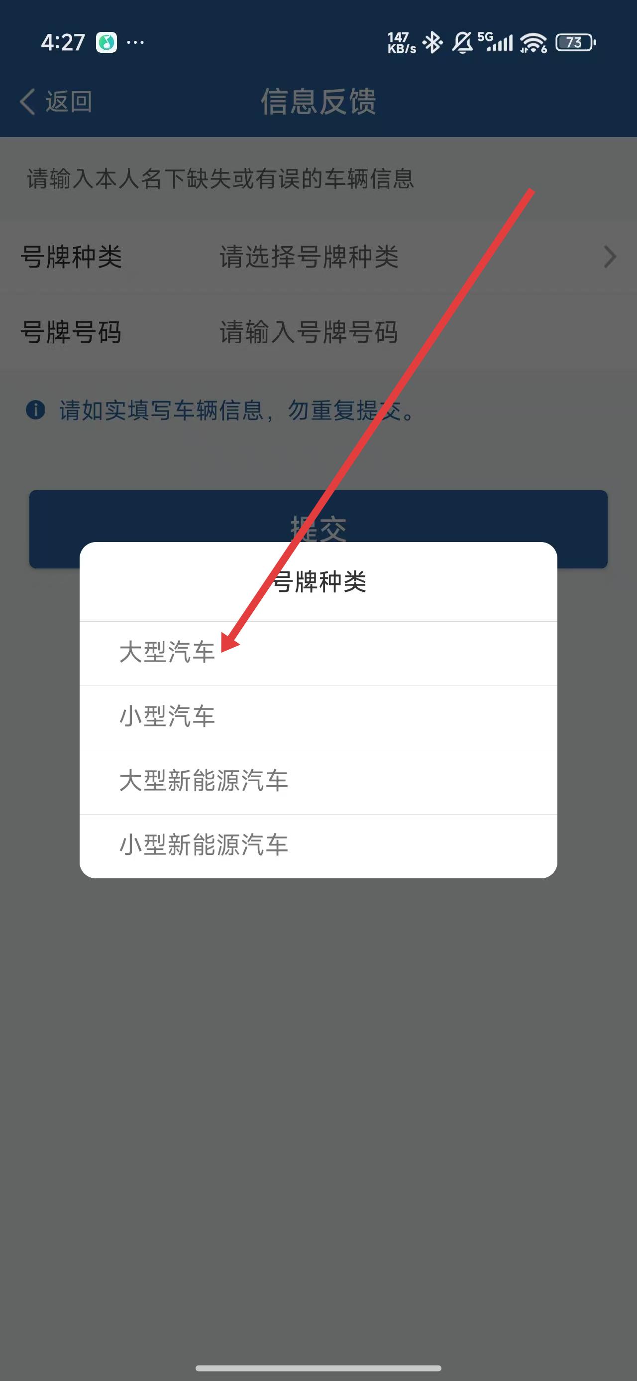 3、在跳轉(zhuǎn)到信息反饋頁面后,可以點(diǎn)擊選擇大型汽車號牌。