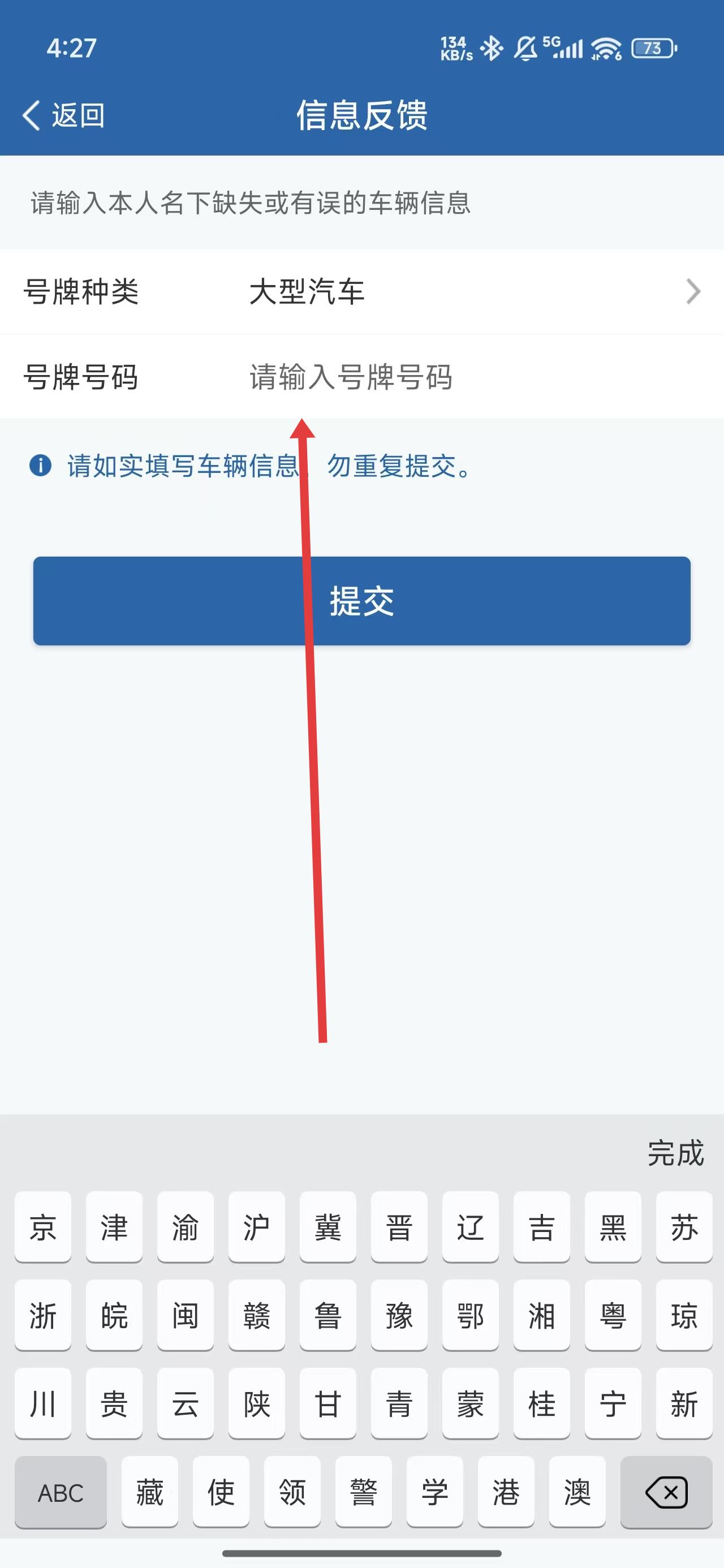 4、在選擇完號牌后,點(diǎn)擊輸入框填寫號牌號碼后完成反饋操作。
