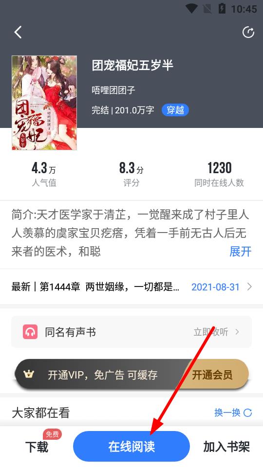 2、進(jìn)入小說詳情頁,點(diǎn)擊在線閱讀進(jìn)入閱讀界面。
