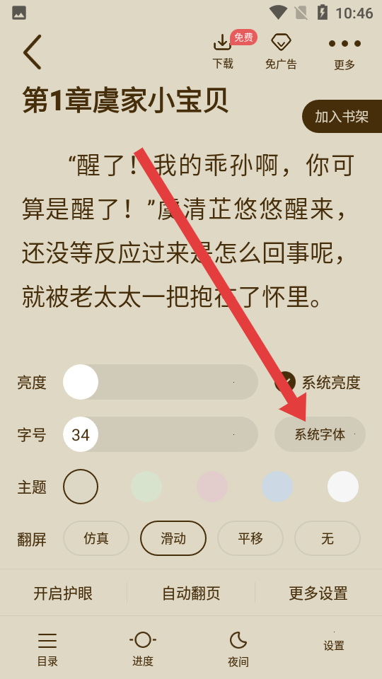 4、在設(shè)置菜單里,找到字號(hào)旁邊的系統(tǒng)字體選項(xiàng),來更改小說字體樣式。