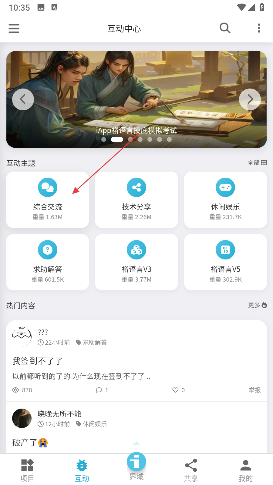 1、打開iApp應(yīng)用,進入互動中心頁面,在互動主題板塊中點擊想要進入的交流板塊,比如綜合交流選項,進入綜合交流板塊。