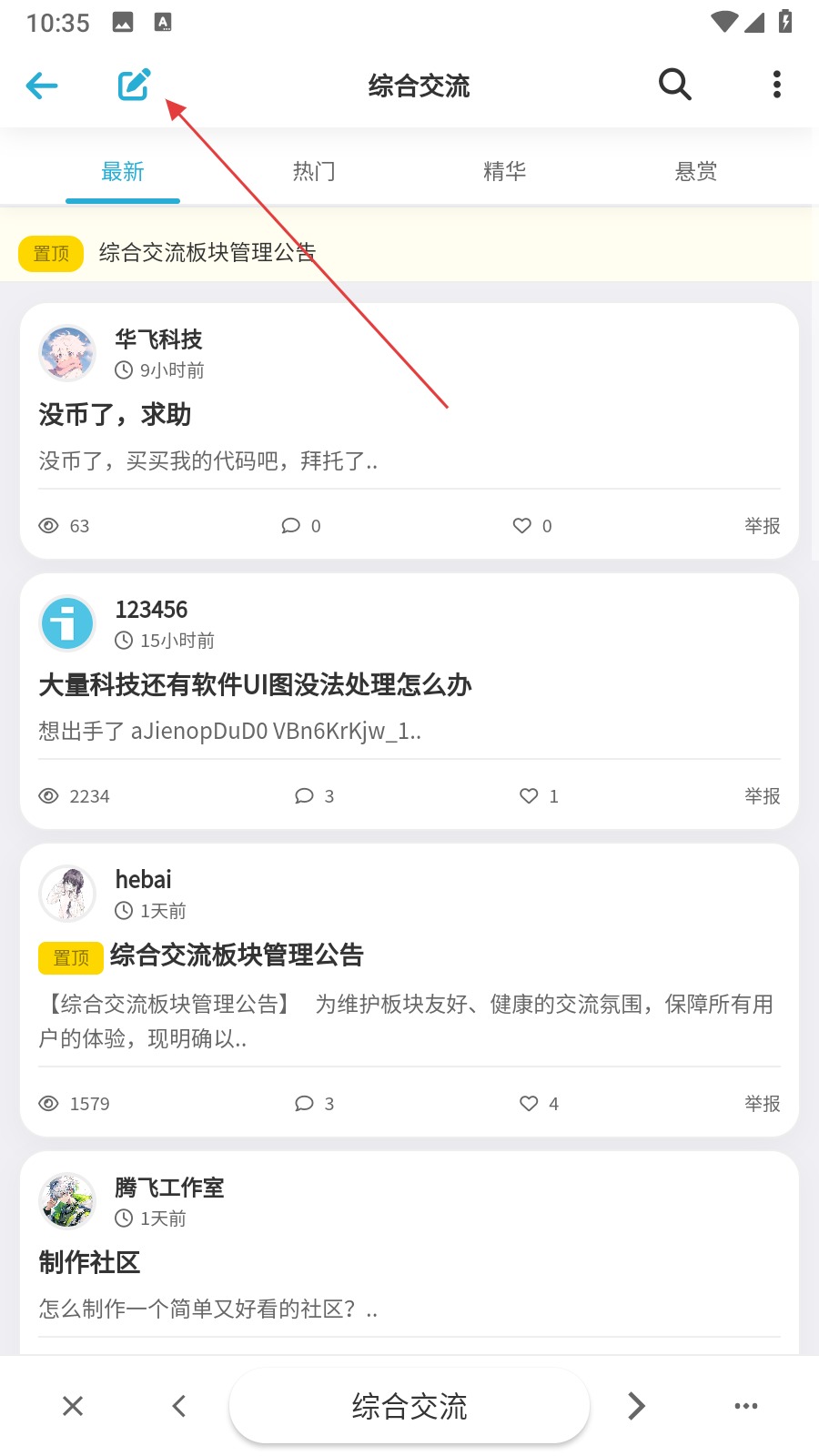 2、在綜合交流板塊頁面,點擊左上角的編輯圖標(biāo),進入發(fā)布內(nèi)容編輯界面。