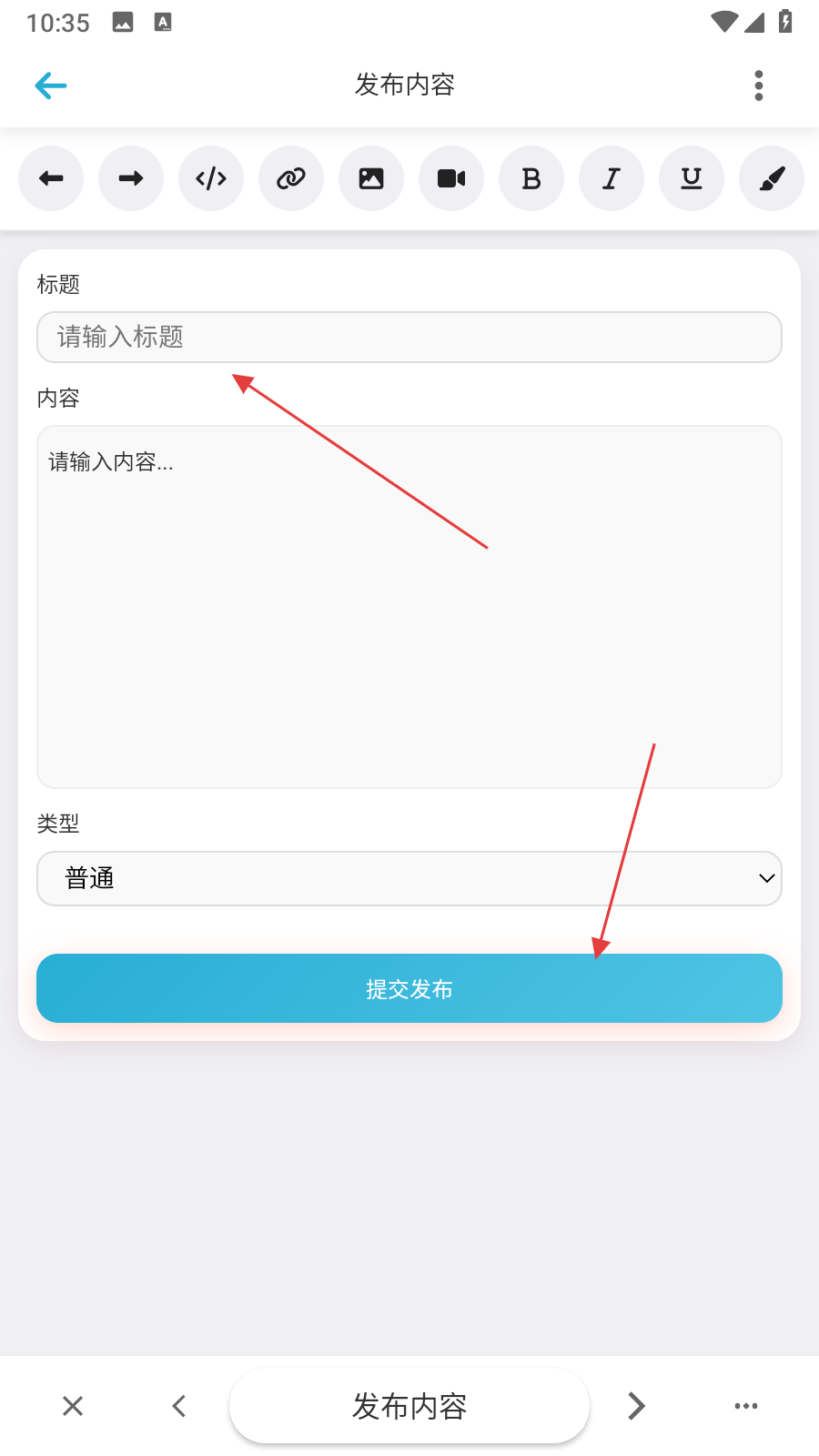 3、在發(fā)布內(nèi)容界面,輸入標(biāo)題,輸入內(nèi)容,選擇內(nèi)容類型,完成后點擊底部藍色提交發(fā)布按鈕,即可發(fā)布動態(tài)。