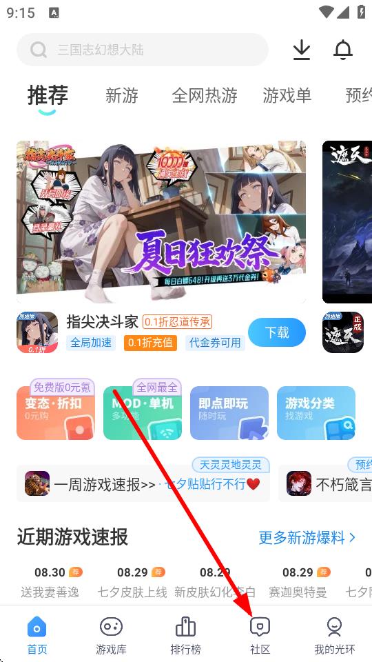 1、打開光環(huán)助手app進(jìn)入首頁,點(diǎn)擊底部導(dǎo)航欄中的社區(qū)圖標(biāo)進(jìn)入社區(qū)頁面。