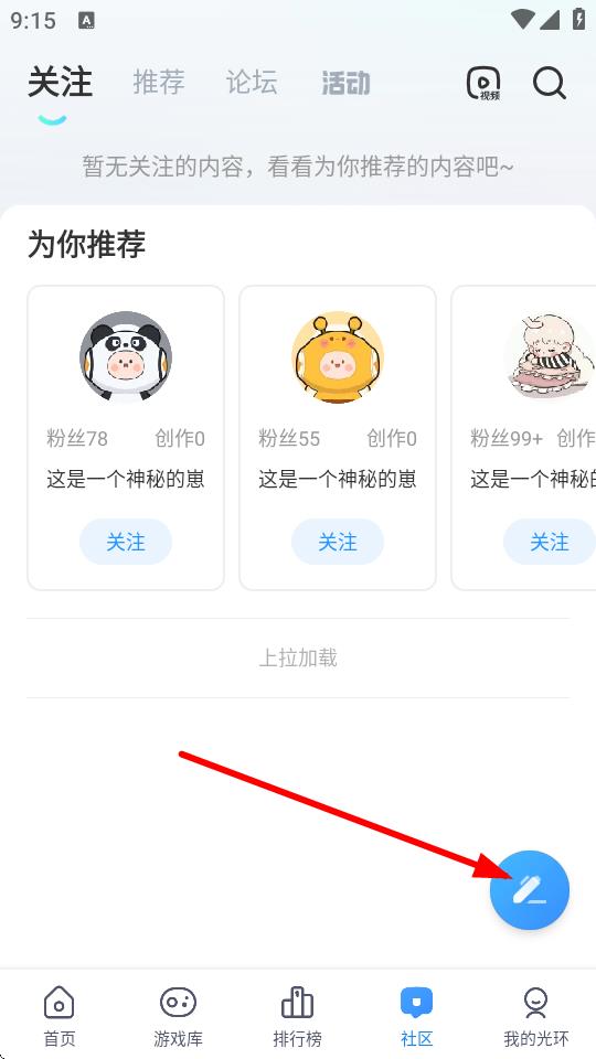 2、在社區(qū)頁面右下角,點(diǎn)擊藍(lán)色帶筆的圓形按鈕,彈出發(fā)布選項(xiàng)框。
