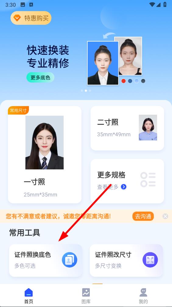 1、打開精美電子證件照app,在首頁的常用工具板塊中,點擊證件照換底色按鈕。