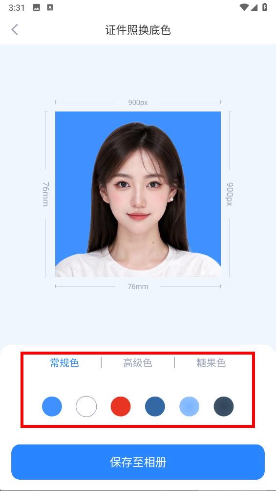 4、選好背景顏色后,點擊界面下方的保存至相冊按鈕,將換好底色的證件照保存。