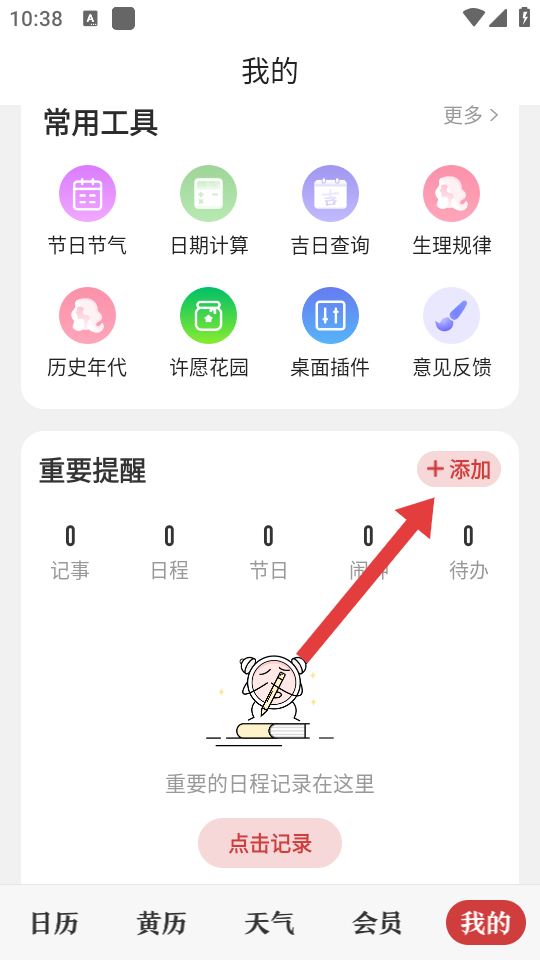 1、進入微鯉萬年歷我的頁面,點擊重要提醒右側(cè)的+添加按鈕,進入提醒添加界面。