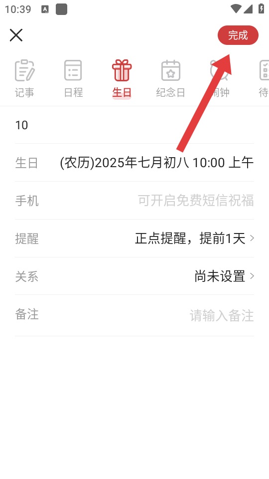 2、在提醒添加界面選擇生日分類,填寫生日日期、提醒方式等重要的信息,填寫完成后點擊右上角完成按鈕。