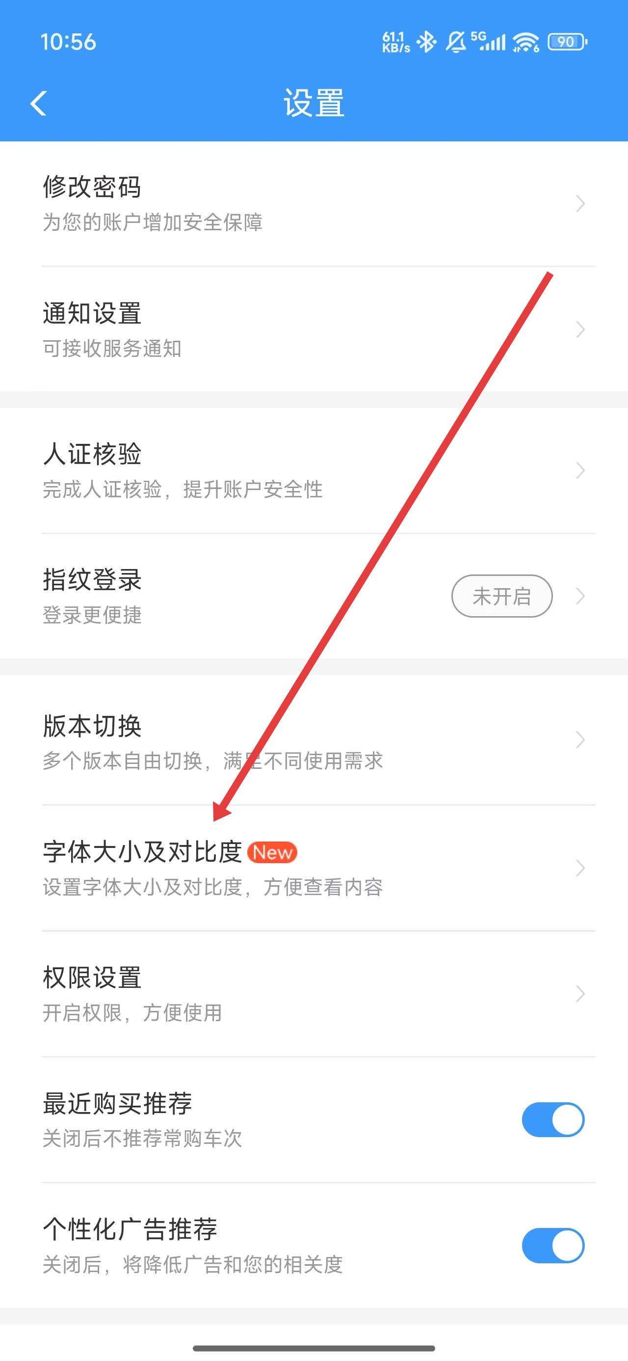 2、在進入到設置頁面后,可以點擊字體大小及對比度選項進入設置。